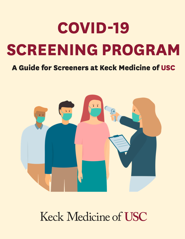 A training tool for newly hired COVID-19 screeners at Keck Medicine of USC. The guide was created to teach screeners how to keep patients, staff, and visitors COVID-19 compliant across all Keck Medicine of USC facilities. It provides information on the daily screening process, where to locate supplies, facility compliance policies, and more.